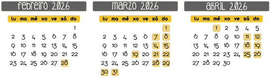 - Abril: 1, 11-12, 18-19, 25-26